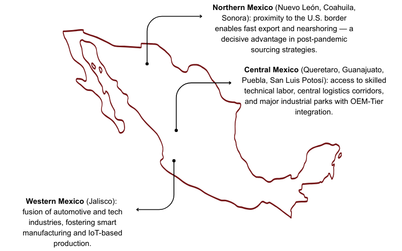 Mexico’s automotive industry supply chain doesn’t revolve around a single city — it’s a network of specialized clusters, each with its own DNA. Together, they create a dynamic ecosystem that fuels the country’s rise as a global hub for automotive purchasing and supply chain excellence.